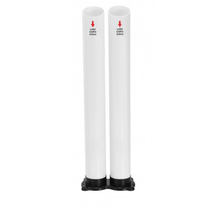 Possui dois tubos para descarte de copos de 180/200mL (água), os tubos são extrusados em plástico poliestireno (PSAI) e a base é injetada em plástico polipropileno (PP).